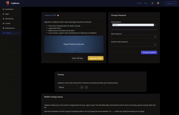CapRover now offers theme customization to give you more control over the look and feel of your dashboard. Utilizing Ant Design for our front-end framework, you can tailor the UI to match your preferences. To get started, refer to the Ant Design customization documentation for detailed guidance. By tweaking variables such as primary color, border radius, and font size, you can create a personalized theme that reflects your brand or taste. Happy theming!